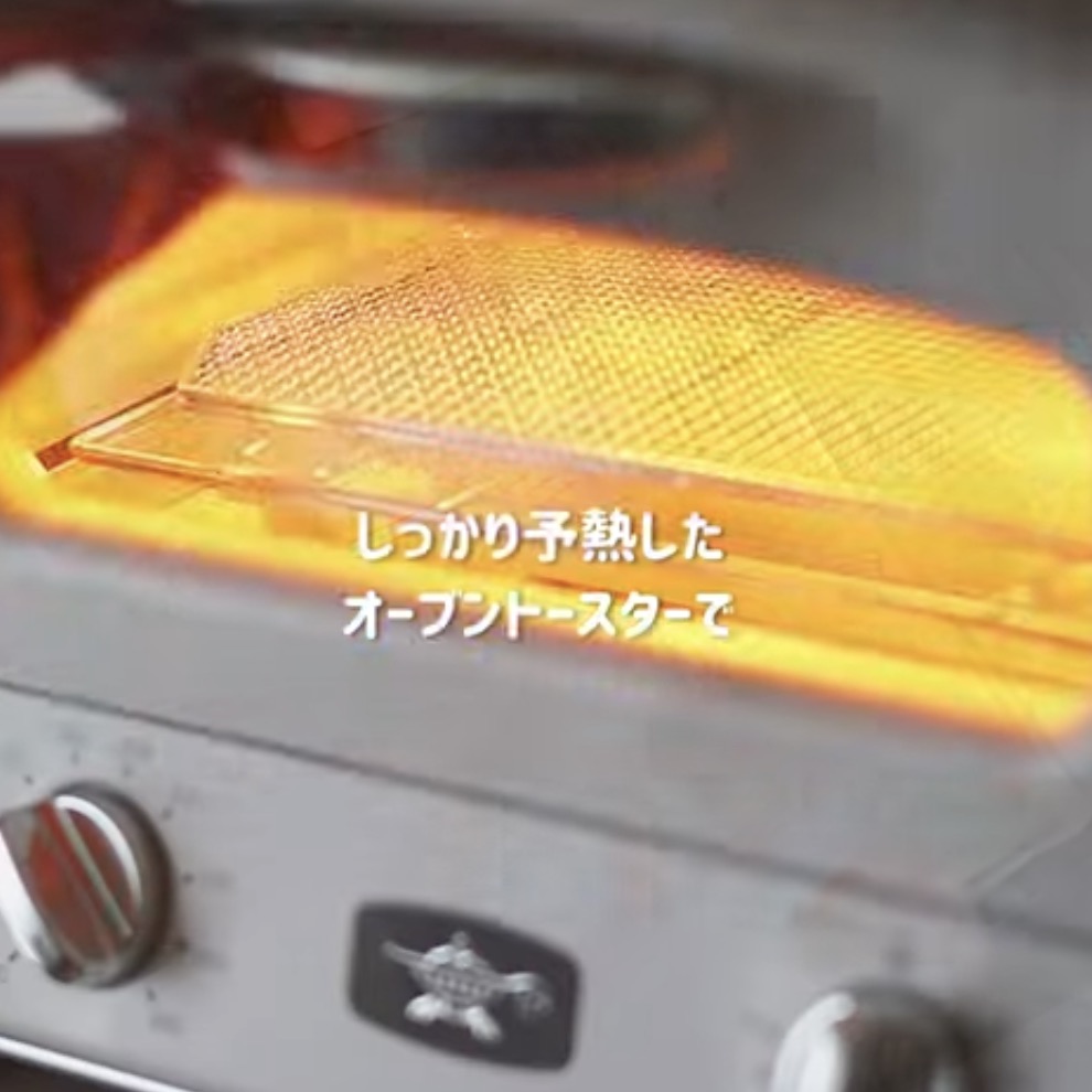 - 250℃にしっかり予熱したオーブントースターに入れ、こんがりと焼き色がつくまで5〜8分ほど焼きます。