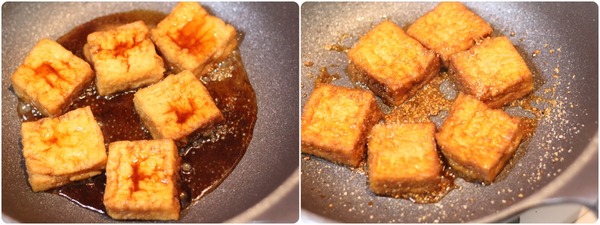 - 火力を中火に上げ、タレにとろみがつくまで加熱します。厚揚げの上下を返すように手早く炒め、全体にタレをしっかり絡めます。