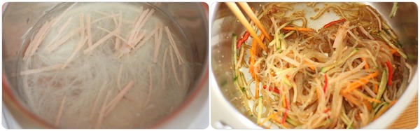 緑豆春雨だけを戻すなら、ボウルでOKなのですが、ハムも茹でたかった(簡単にほぐれる為)ので鍋を使いました。緑豆春雨は戻したあとにカットする方が、やわらかくなって簡単です。調味料の割合など詳しい作り方はこちら
