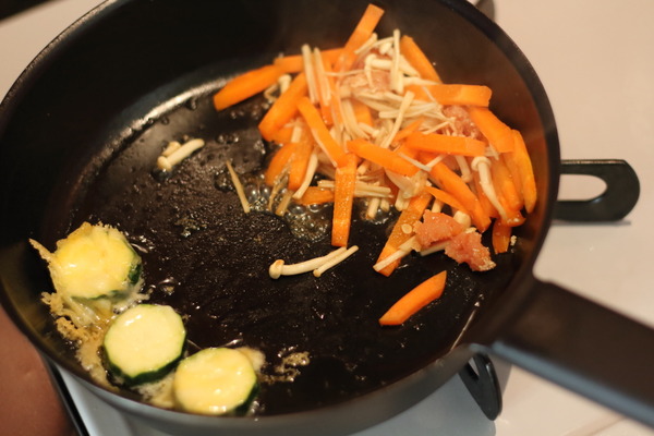 その隣の鍋でお湯を沸かし、はるさめとハムを茹でる。 - フライの鍋を片付け、新しいフライパンで「ズッキーニ」、「えのき・にんじん」を同時調理。