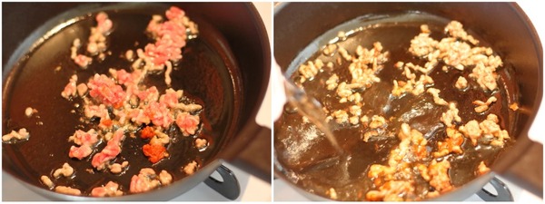 3. フライパンでミンチを炒め、スープを煮立てる。