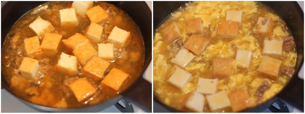 4. 厚揚げを加えてとろみをつけ、卵を回し入れれば完成!