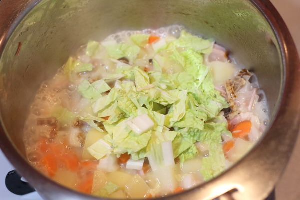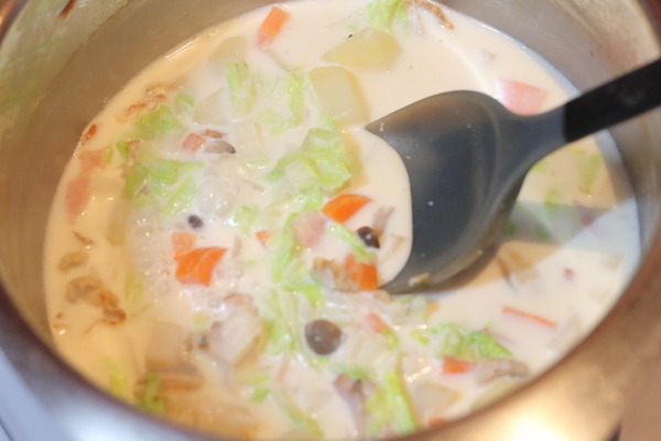 - 具が柔らかくなったら白菜・牛乳を加え、【A】で味を調える。