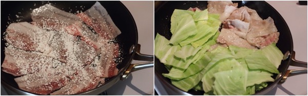 - 豚バラ肉に小麦粉(もしくは米粉)を振り、フライパンに並べて中火で炒める。