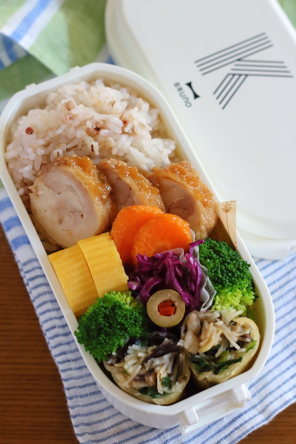 - 副菜: 巻きす仕上げの卵焼き、茹でブロッコリー、紫キャベツのマリネ