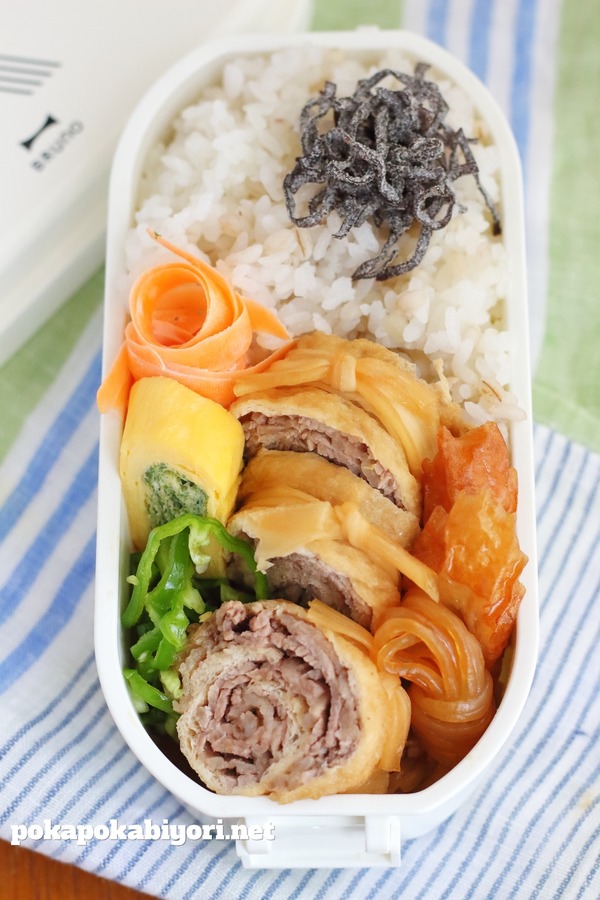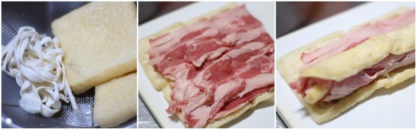 - 開いたうすあげに牛肉(80g)を広げて並べ、端からきつく巻いてかんぴょうで数箇所結ぶ。