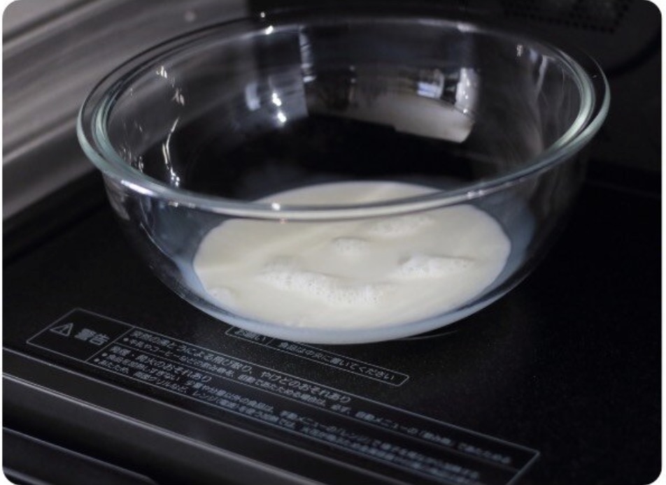 - 牛乳を電子レンジで40〜50℃に温めます。
