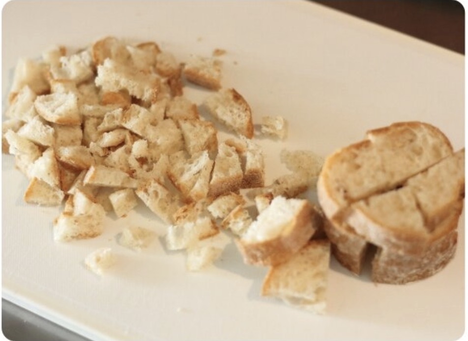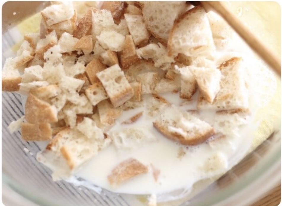 - バゲットの半分を大きく、残りを細かく刻み、温めた牛乳に浸してやわらかくします。