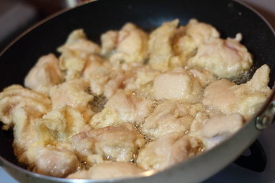 - フライパンに揚げ油を熱し、鶏もも肉を並べ入れます。