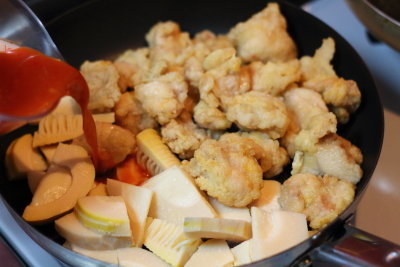 たけのこがおいしい季節にぜひお試しいただきたいのが、エビチリ風の味付け!今回は、エビよりも安価で食べ応え抜群な鶏肉と合わせてみました。