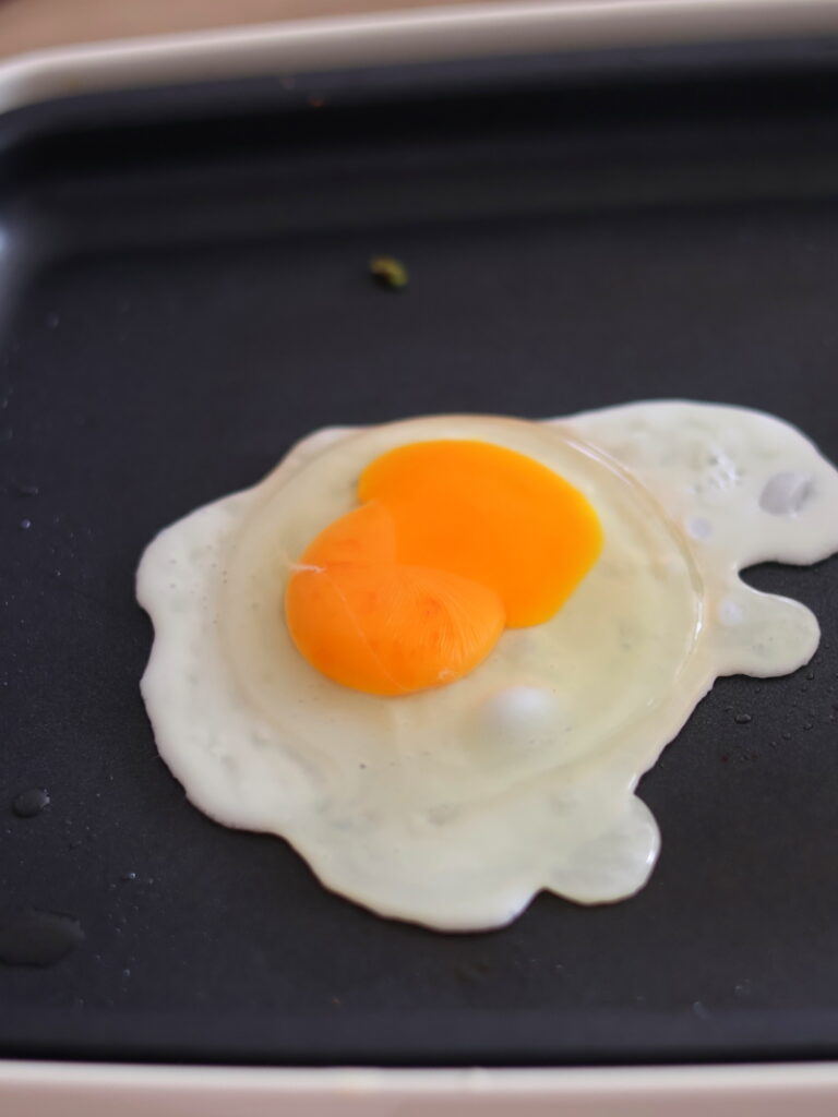 - 卵を割り入れ、その上にスライドさせて合体させます。
