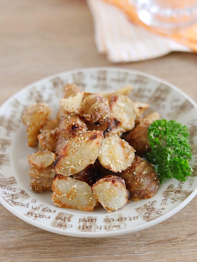 - 熱いうちに、コンソメ顆粒と粉チーズを絡める。