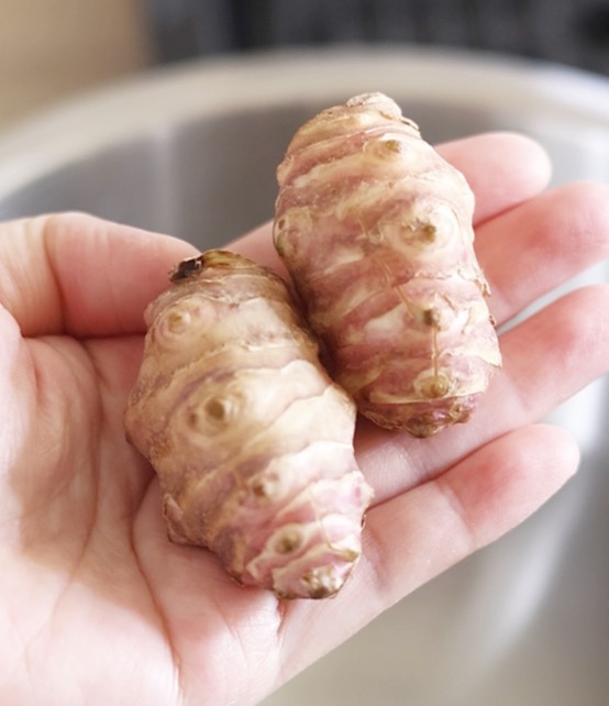 - 菊芋は皮ごとタワシで洗い、一口大の乱切りにする(※水にはさらさない)