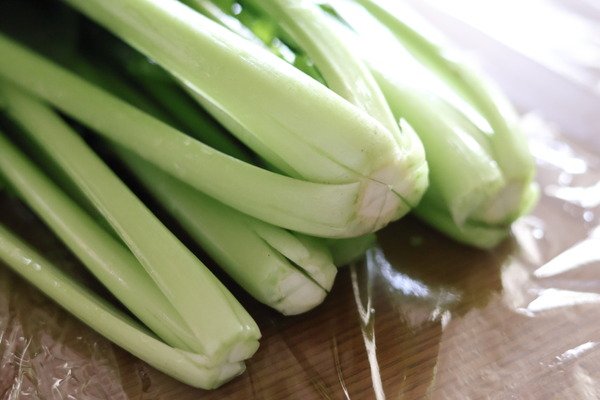 小松菜の根元に十字の切り込みを入れることで、火の通りが均一になります。