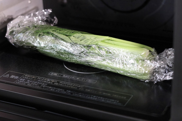 - 小松菜は洗い、根元に十字の切り込みを入れてラップで包み、電子レンジ(600W)で2分加熱する。