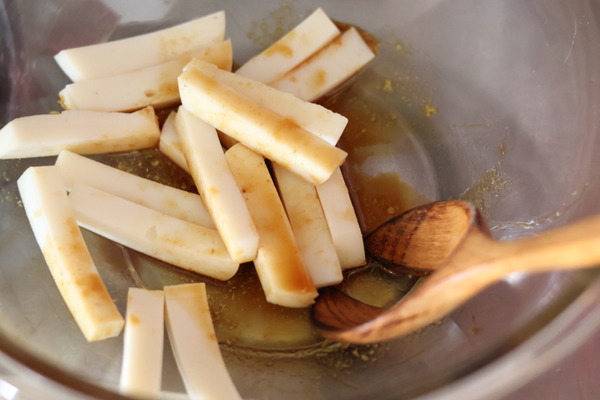 - かまぼこは食べやすい細切りにする。