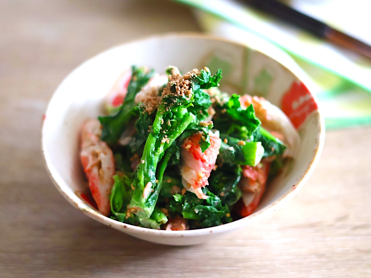 なばなの苦味が消える!子供も喜ぶ『カニカマごまマヨ和え』が春の副菜に最高すぎた