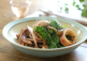 【菜の花とイカのバター醤油炒め】レシピ