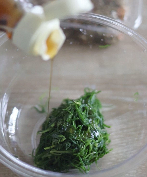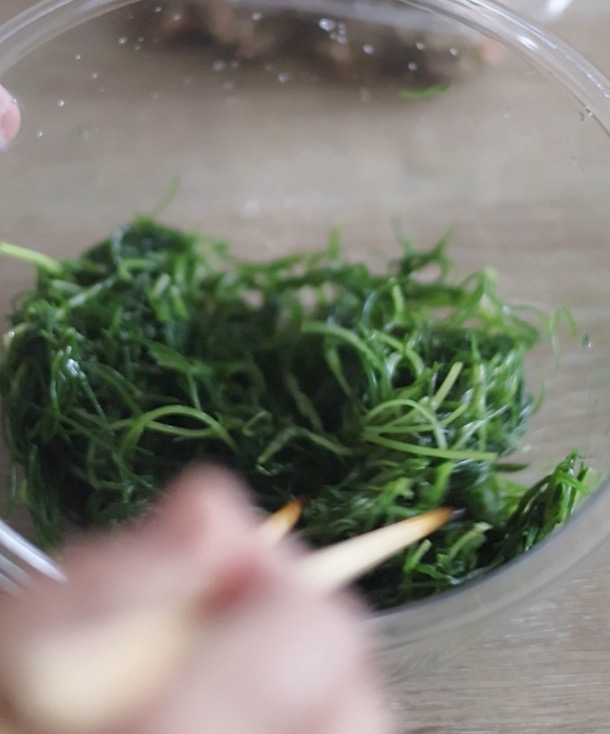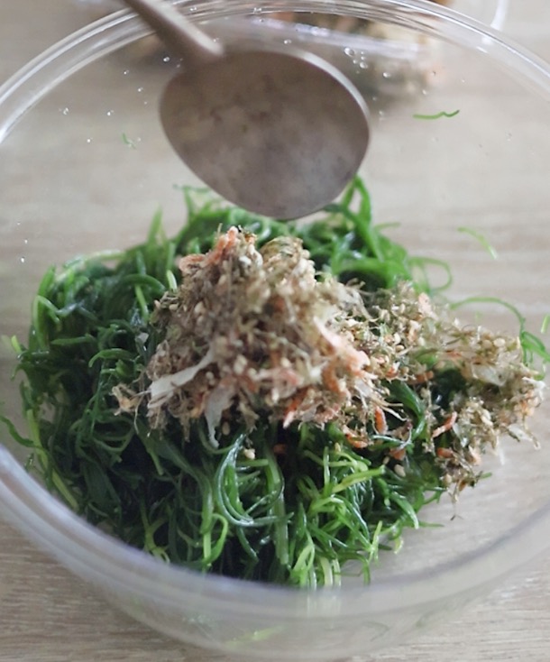 おかひじきは水分を抱え込みやすい形状です。ここでの絞りが甘いと、いか昆布の旨味がぼやけてしまいます。「少し強すぎるかな」と思うくらいしっかり絞るのが、おいしく作るコツです。