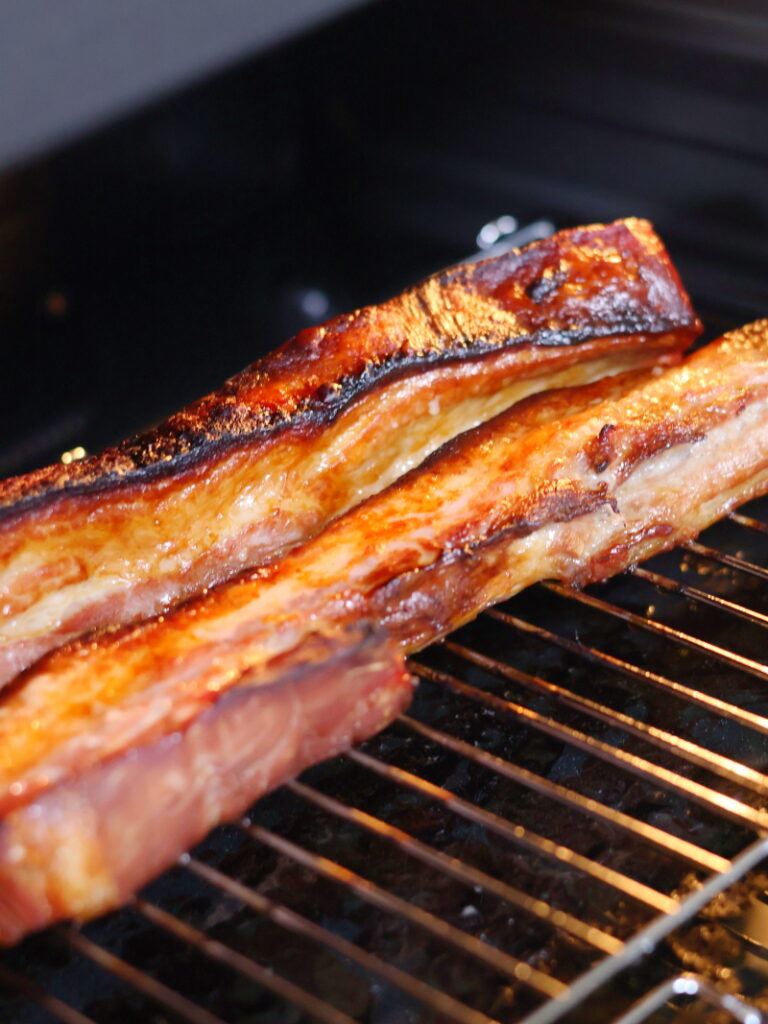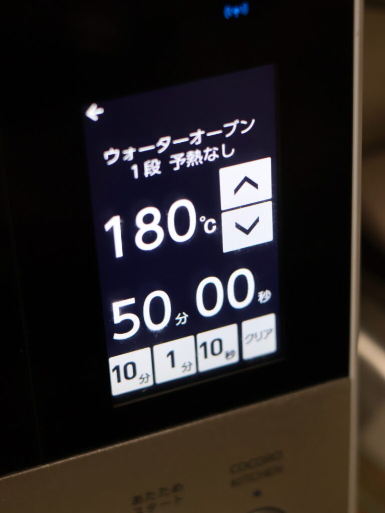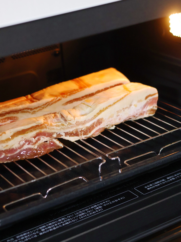ローストポークは、よさげな肩ロース肉に出会えず、バラ肉で作ったため、下味は濃いめ(脂は味が染み込みにくいため)。ウォーターオーブンヘルシオ(下段1段、網あみ、予熱なし)180℃50分、その後しばらく放置。たこ糸なしでも形崩れませんでした。