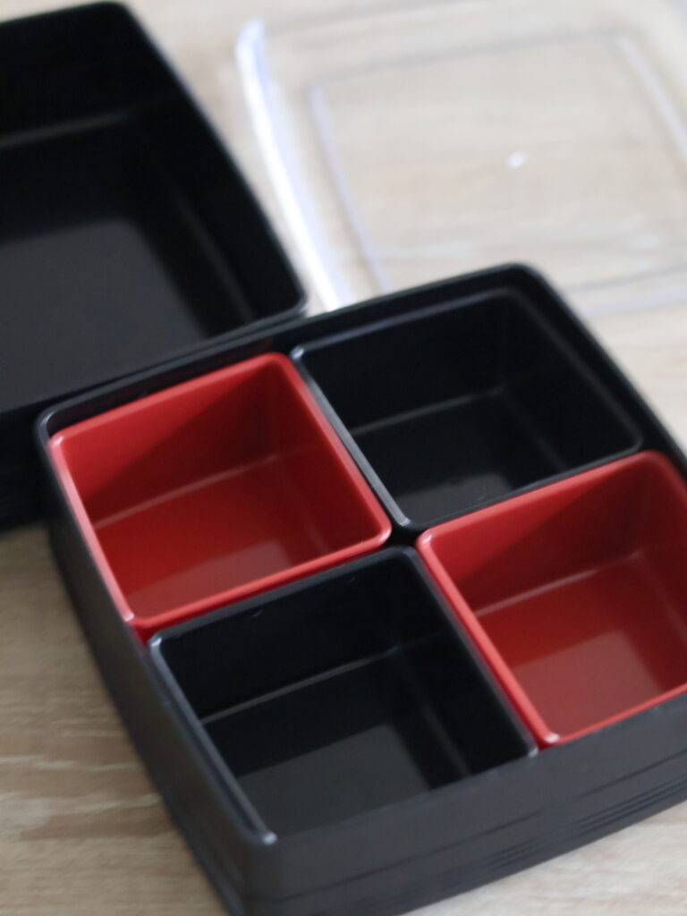 - 外側は光沢のある黒、内側は料理が映える赤(朱色)のデザインです。