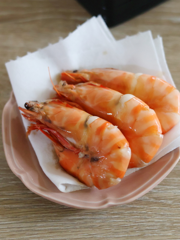・有頭えびは国産の車海老で、新鮮なものをチョイス(今回はオーストラリア産冷凍天然えびを使った為、背わたがペースト状で緑色っぽく、取るのが大変だった)
