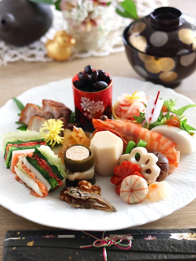 お煮しめは今回、鍋で作りました。電気圧力鍋で作る時の味付けとさほど変わりません。花こんにゃくはレンジであく抜き(沸々してから3分加熱)、手まり麩はいつもの商品に出会えず、生麩。れんこんは色白にしあがるように、酢水で別茹でしてから合わせました。いんげんは、安い時に購入して下茹で冷凍しておき、最後に合わせています。