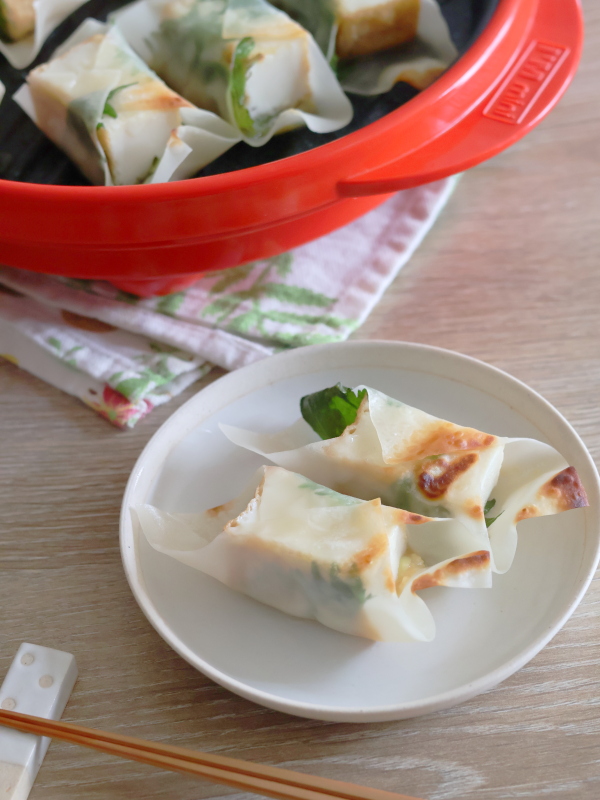 - 厚揚げのサイズはワンタンの皮で包んだ時に、写真のように少し重なる程度の大きさに調整してください。