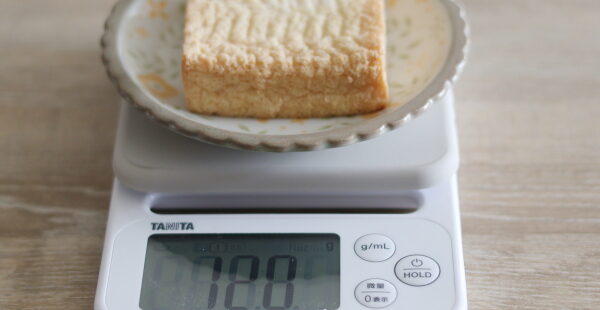 こちらの絹厚揚げ2枚入り1パックの半分=1枚を使用しています。計量すると120gありました。分量は少々前後しても構いませんが、それに合わせてワンタン皮・大葉の分量なども調整してください。