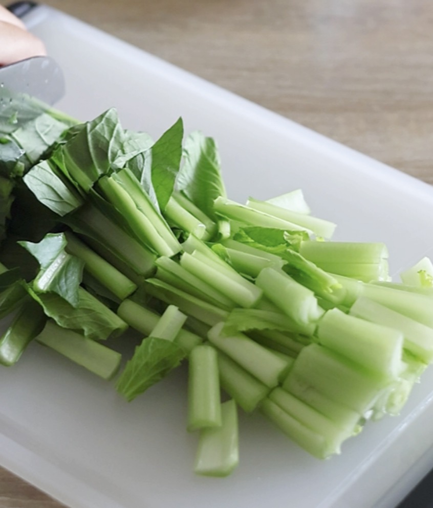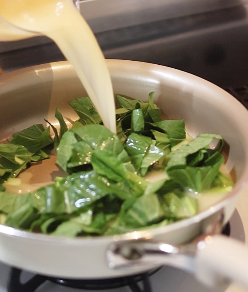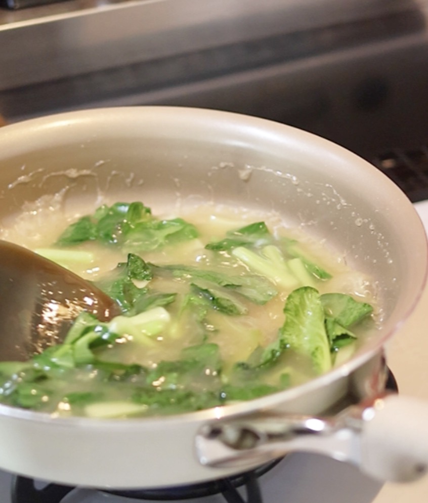 • 小松菜を4cm長さに切り、油を引いたフライパンで中火で炒める。