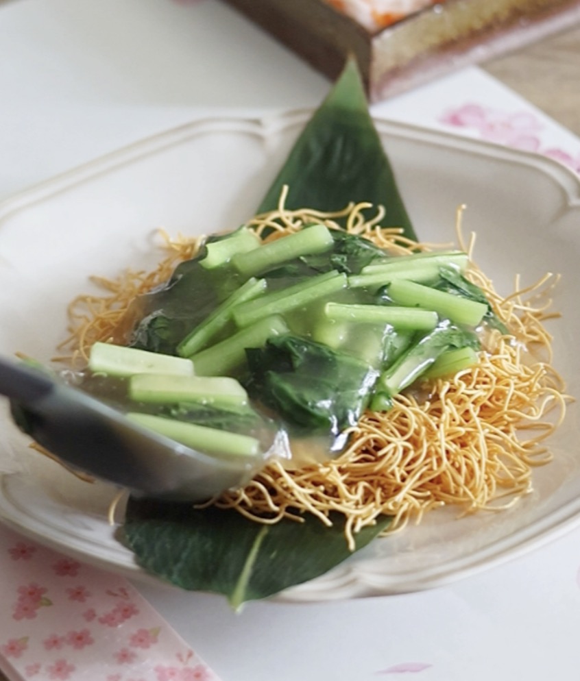 • 器に軽く砕いた皿うどんのめんを盛り、1のあんをかける。