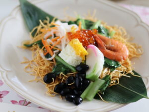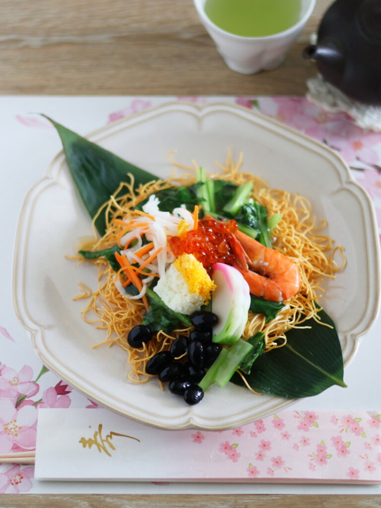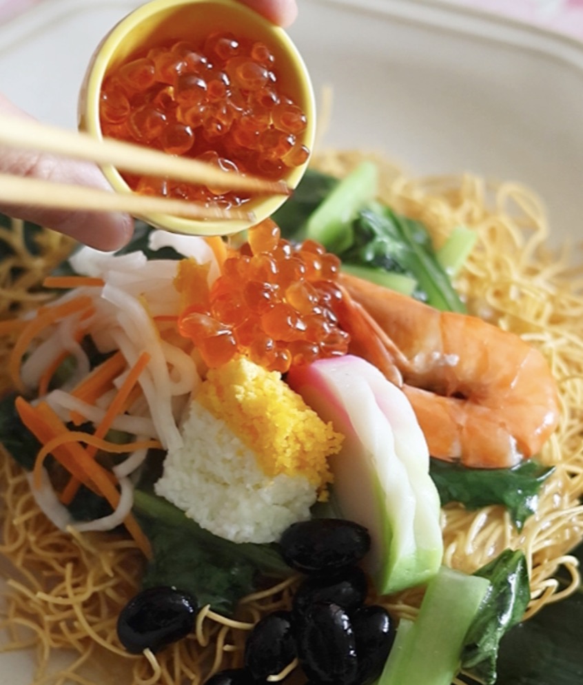 • 上からお好みのおせち料理(海老・かまぼこ・なます等)を華やかに盛り付けて完成。