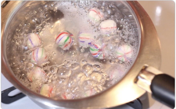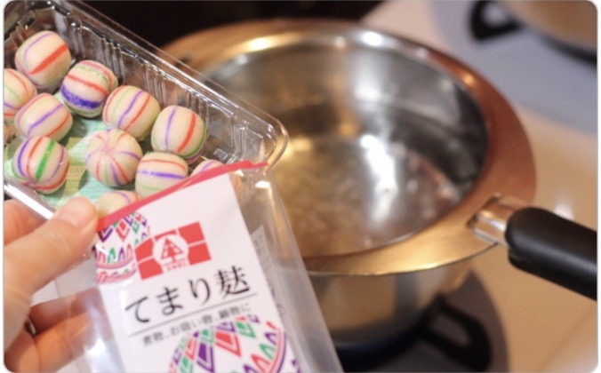 真空パックや、乾燥した「てまり麩」もあるのですが、この商品の発色が美しいので、毎年これだけは、年末の人混みを覚悟して買いにいきます。お煮しめの最初から一緒に煮込むと、煮汁が濁るし、火が通り過ぎてトロトロになるので別茹で必須です!