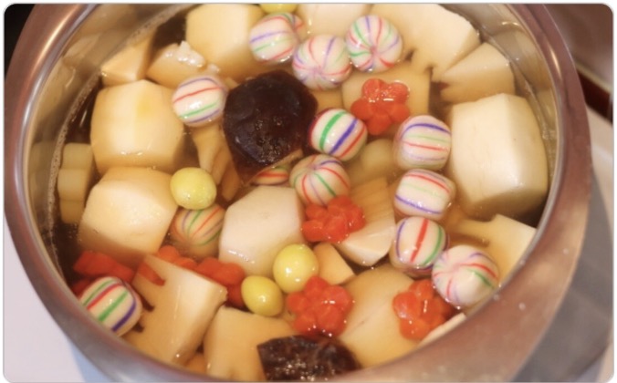 - そのあと、完成したお煮しめに合わせて煮含めます。