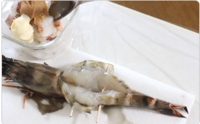 - 殻付きのまま背開きにし、背腸をとって楊枝で形を整え、塩・白ワインをかけて臭み抜き