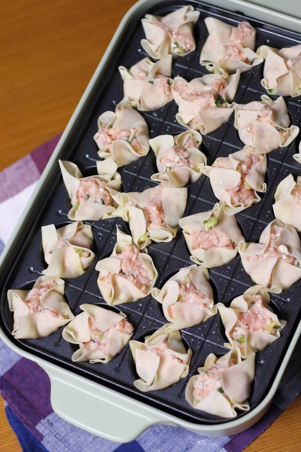 • ホットプレートのたこ焼きプレートを薄く塗り、シュウマイの皮を1枚ずつ穴の上に置きます。皮の上に肉だねをスプーンでのせ、穴の中にギュッと詰め込むイメージで入れていきます。
