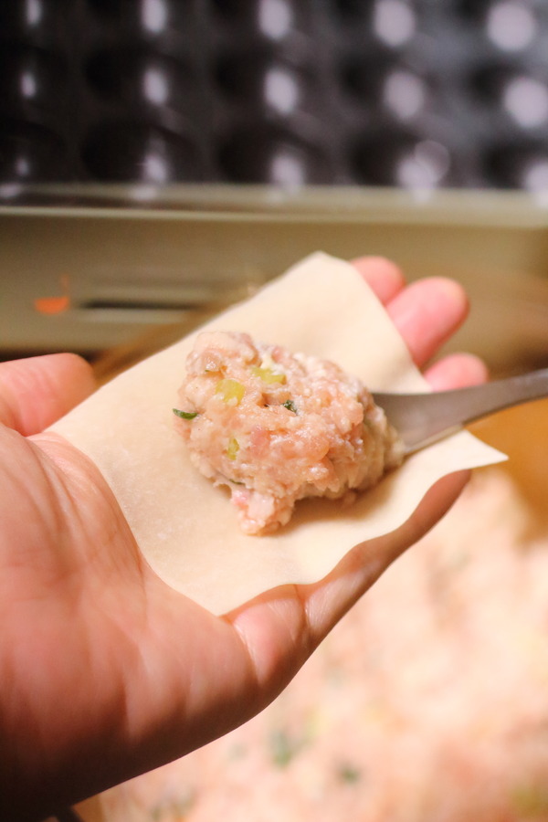もしくは、シュウマイの皮肉だねを乗せてから、穴に詰めても構いません。